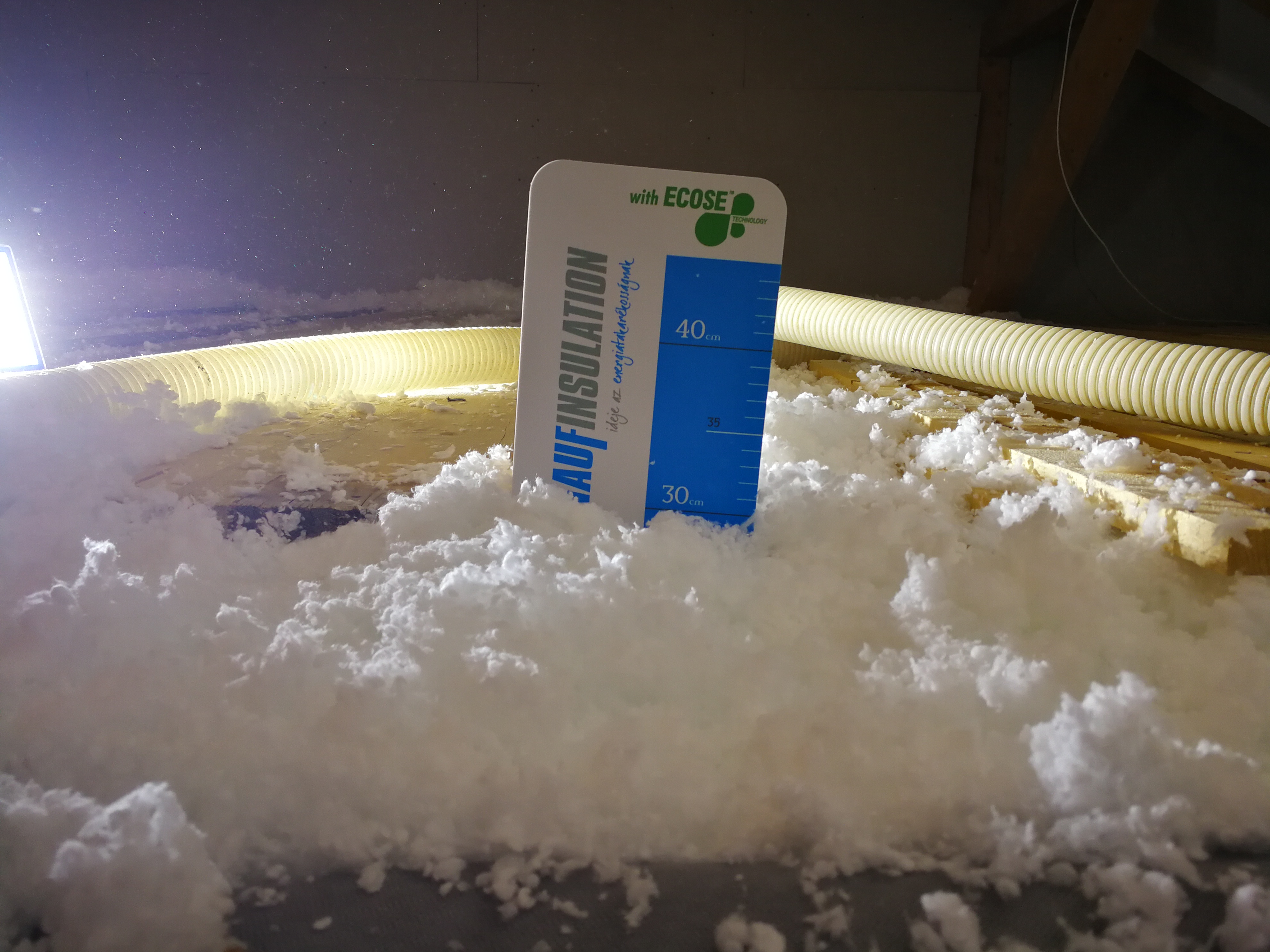 Die Einblasdämmung aus Glaswolle bietet ausgezeichnete Wärmedämmungseigenschaften. Durch die Einspritztechnologie wird eine lückenlose Dämmung der Decke ermöglicht, wodurch die nach oben strömende Wärme effektiv zurückgehalten wird. So kann die Thermoisolierung außergewöhnlich kostengünstig und in ausgezeichneter Qualität durchgeführt werden. Zudem wird die Dämmung deutlich schneller fertiggestellt als mit herkömmlicher Technologie, und auch bisher schwer zugängliche Deckenlücken können wärmebrückenfrei isoliert werden.