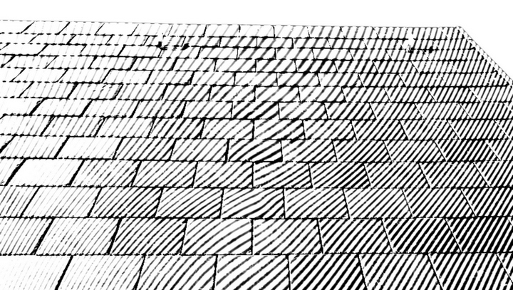 Bei der Universal- oder Bogenschnittdeckung sind die Schiefer quadratisch und je nach Witterungsrichtung rechts oder links angeordnet.